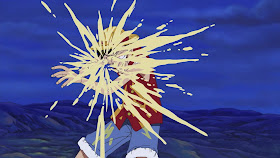 Luffy, vestido como boxeador de afro (durante o Davy Back Fight), acerta um soco direto na coluna do oponente.